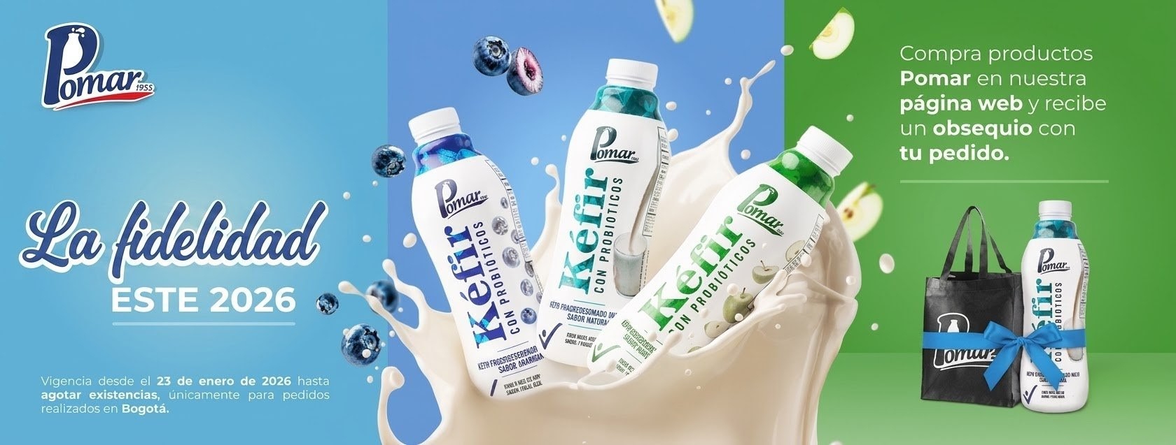 Por compras iguales o superiores a $50.000 COP realizadas exclusivamente a través de nuestra página web “www.encasa.pomar.com.co”, el cliente recibirá de forma gratuita un (1) obsequio consistente en una botella de Kefir de 1000 ml (referencia de lanzamiento).